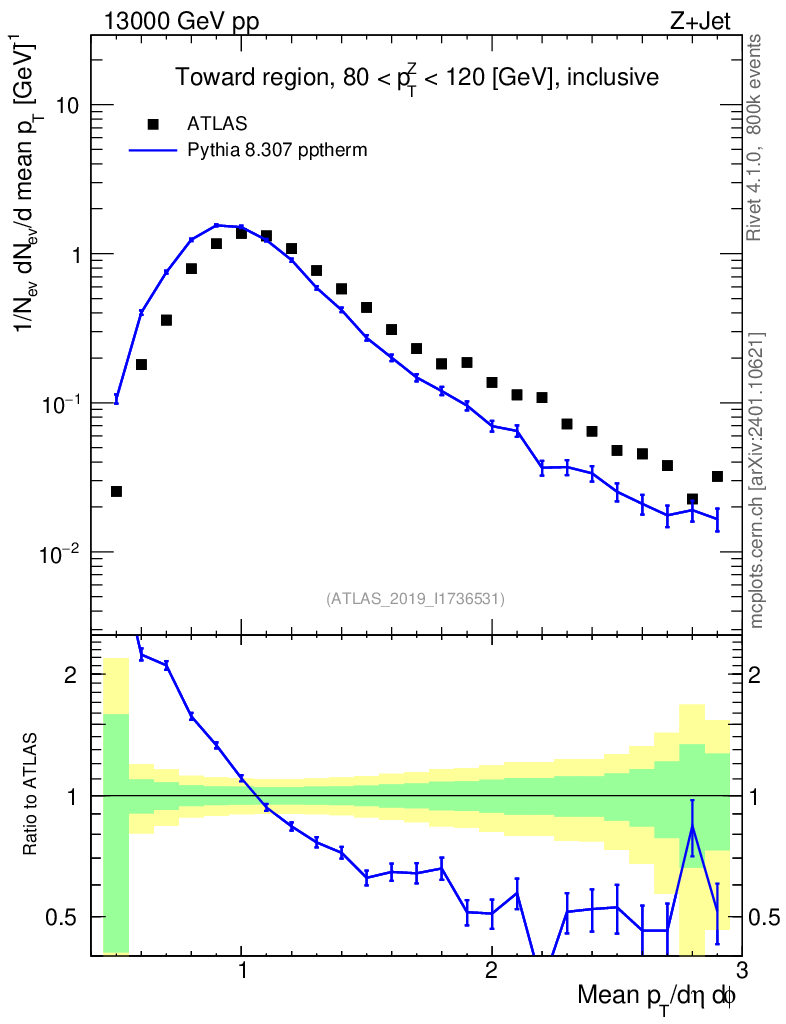 Lines: data, pythia8 8.307 pptherm |