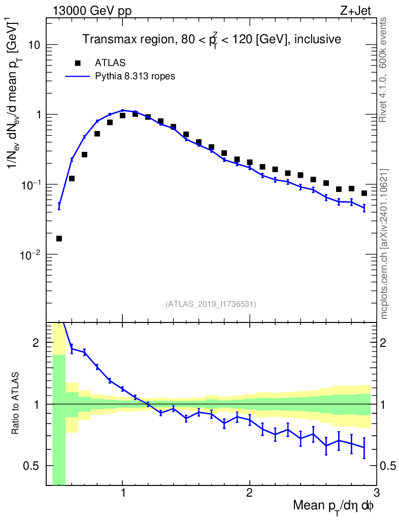 Lines: data, pythia8 8.313 ropes |
