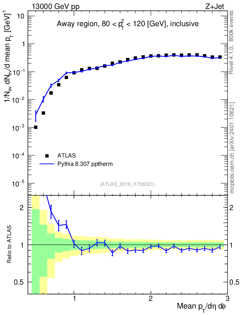 Lines: data, pythia8 8.307 pptherm |