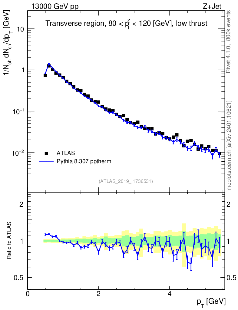 Lines: data, pythia8 8.307 pptherm |