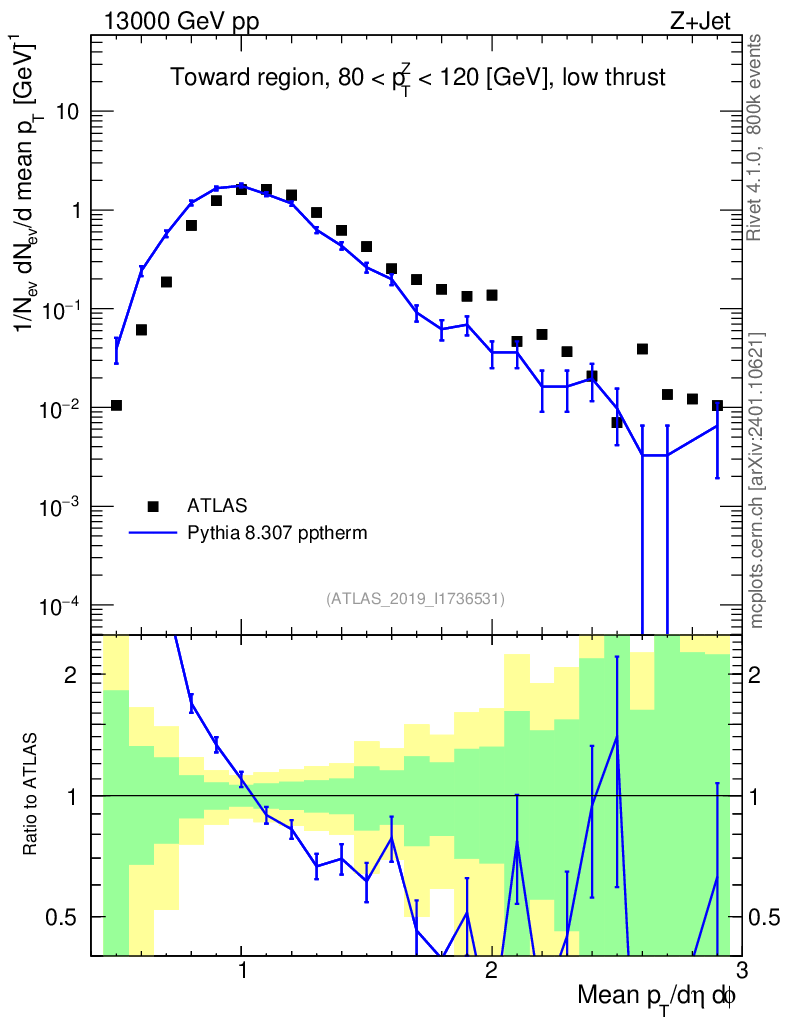 Lines: data, pythia8 8.307 pptherm |