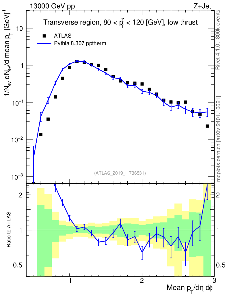 Lines: data, pythia8 8.307 pptherm |