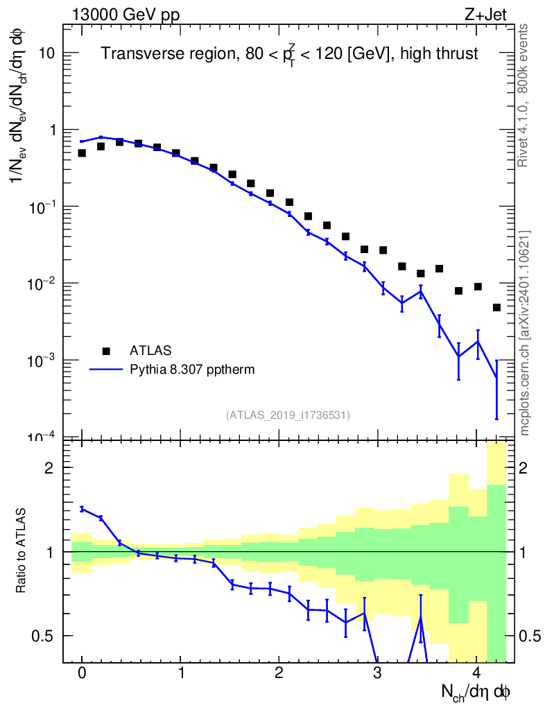 Lines: data, pythia8 8.307 pptherm |