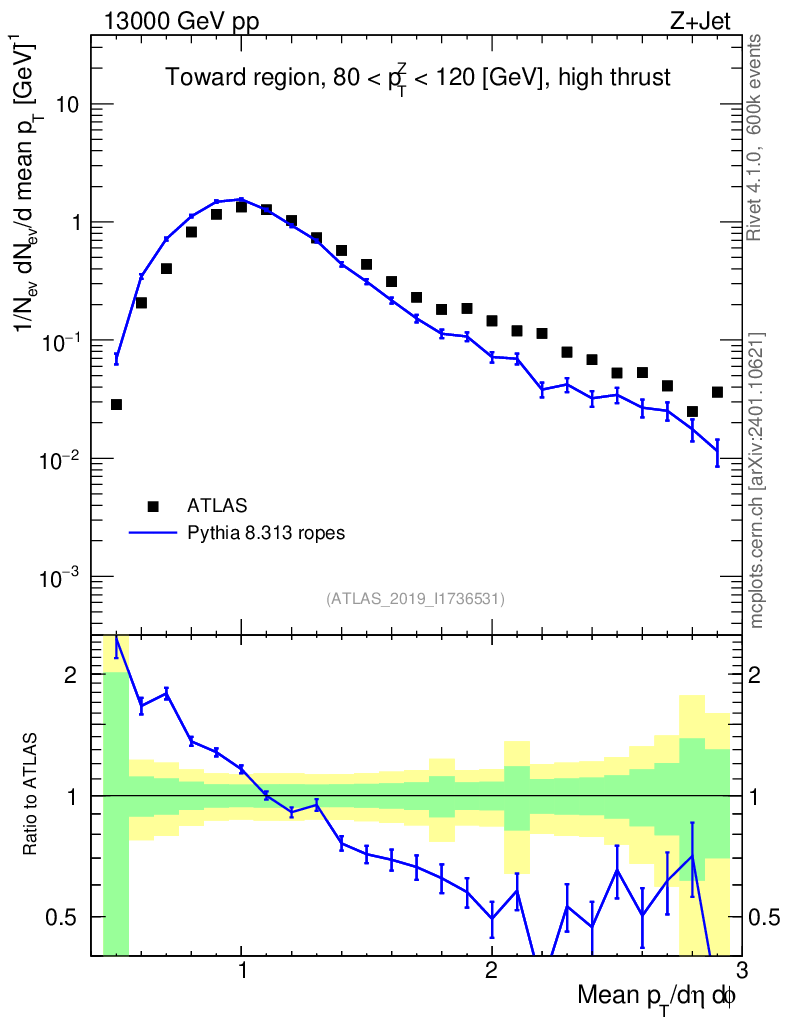 Lines: data, pythia8 8.313 ropes |