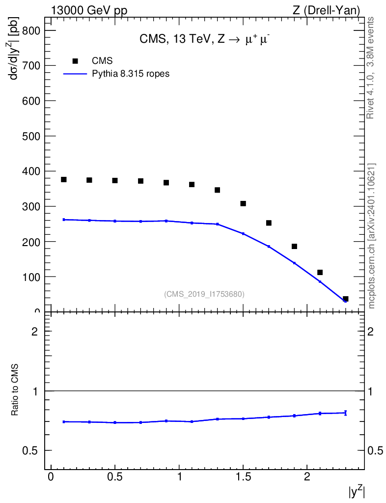 Lines: data, pythia8 8.315 ropes |