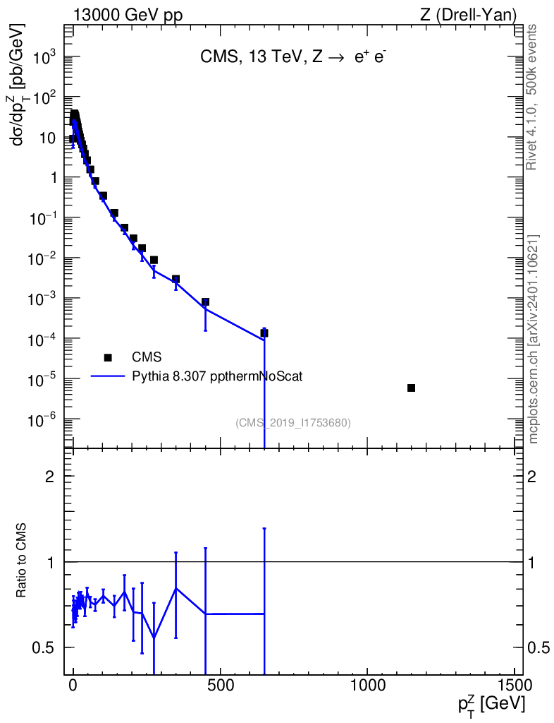 Lines: data, pythia8 8.307 ppthermNoScat |