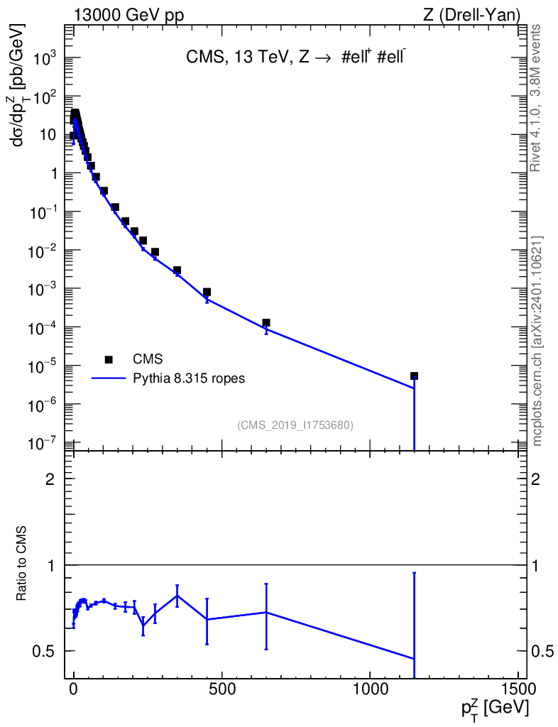 Lines: data, pythia8 8.315 ropes |