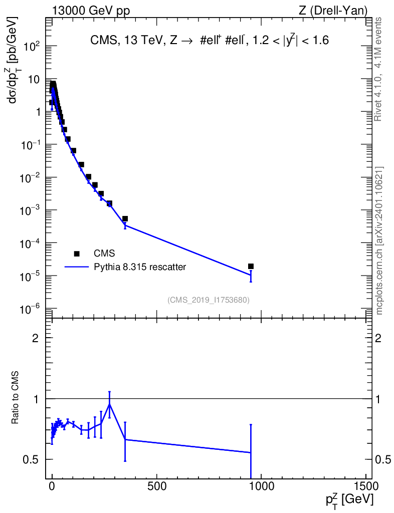 Lines: data, pythia8 8.315 rescatter |