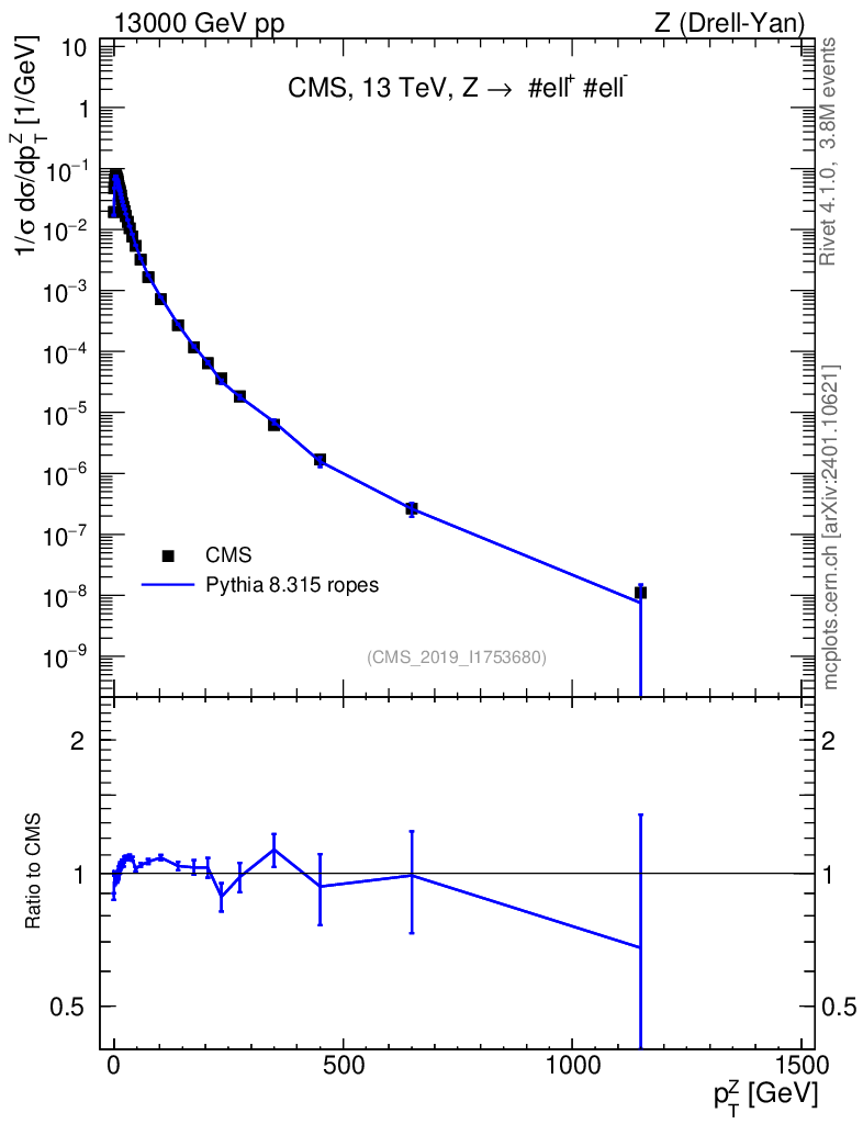 Lines: data, pythia8 8.315 ropes |