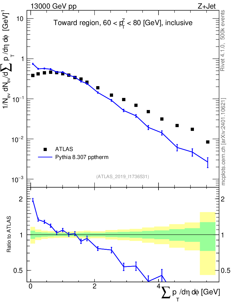 Lines: data, pythia8 8.307 pptherm |