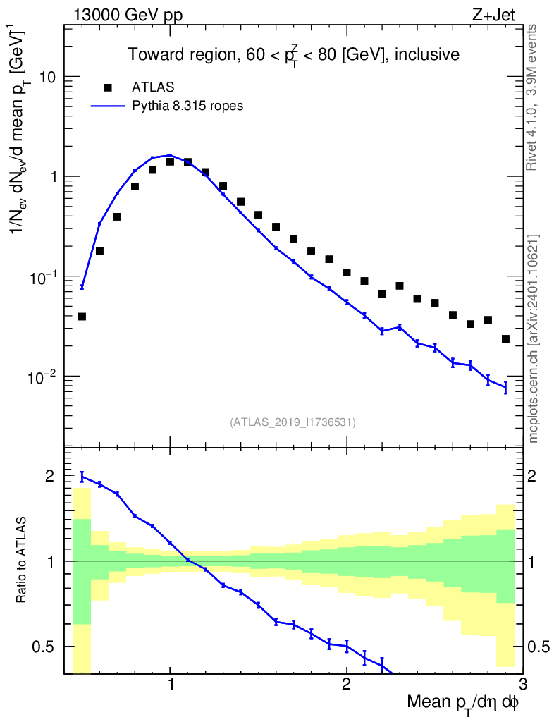 Lines: data, pythia8 8.315 ropes |