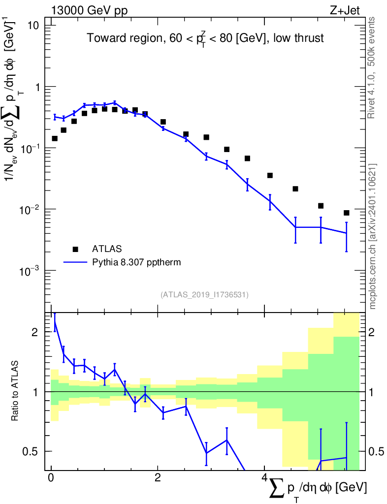 Lines: data, pythia8 8.307 pptherm |