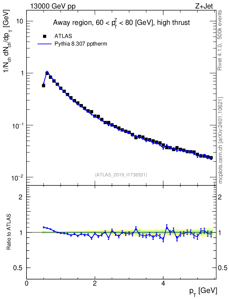 Lines: data, pythia8 8.307 pptherm |