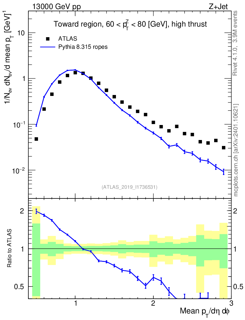 Lines: data, pythia8 8.315 ropes |