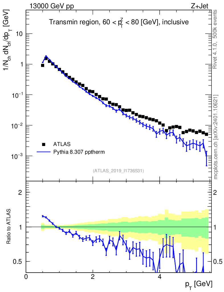 Lines: data, pythia8 8.307 pptherm |