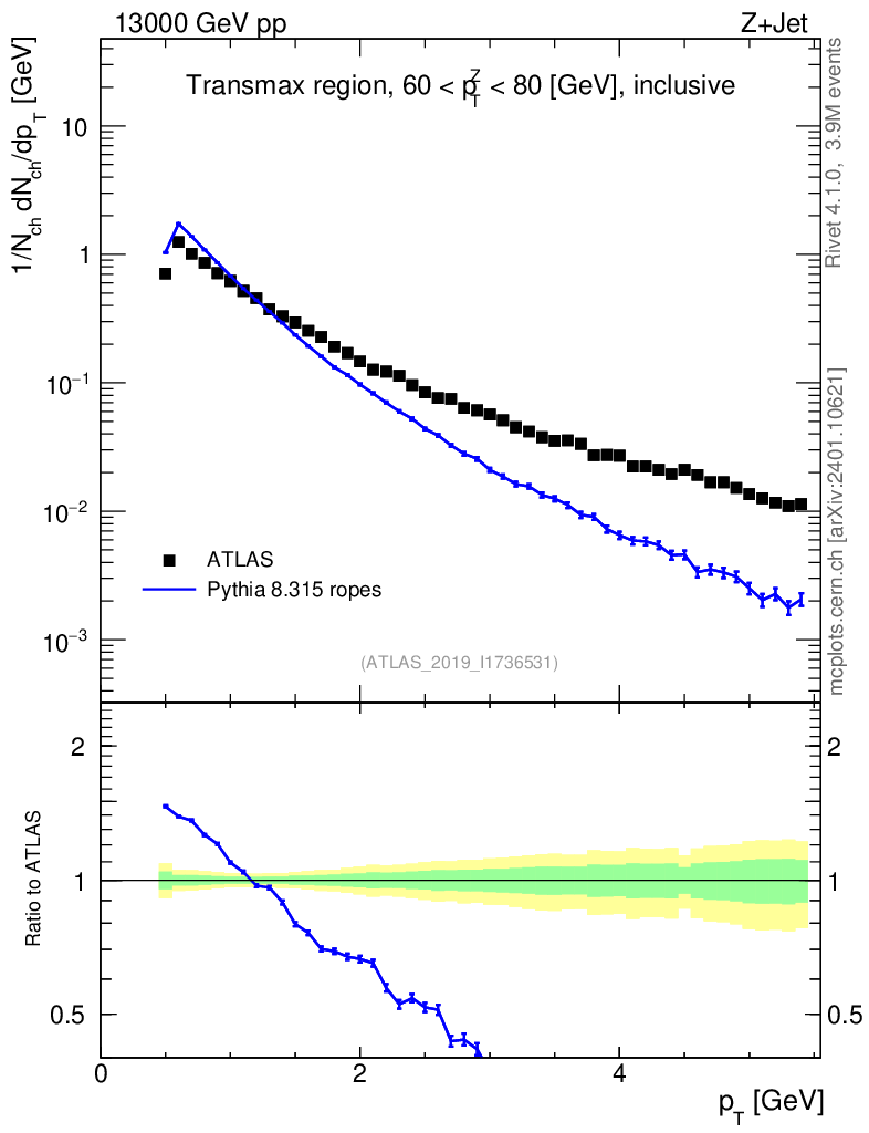 Lines: data, pythia8 8.315 ropes |