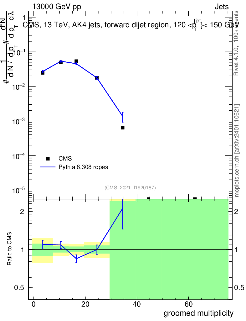Lines: data, pythia8 8.308 ropes |