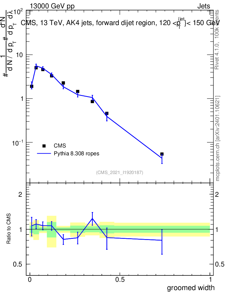 Lines: data, pythia8 8.308 ropes |