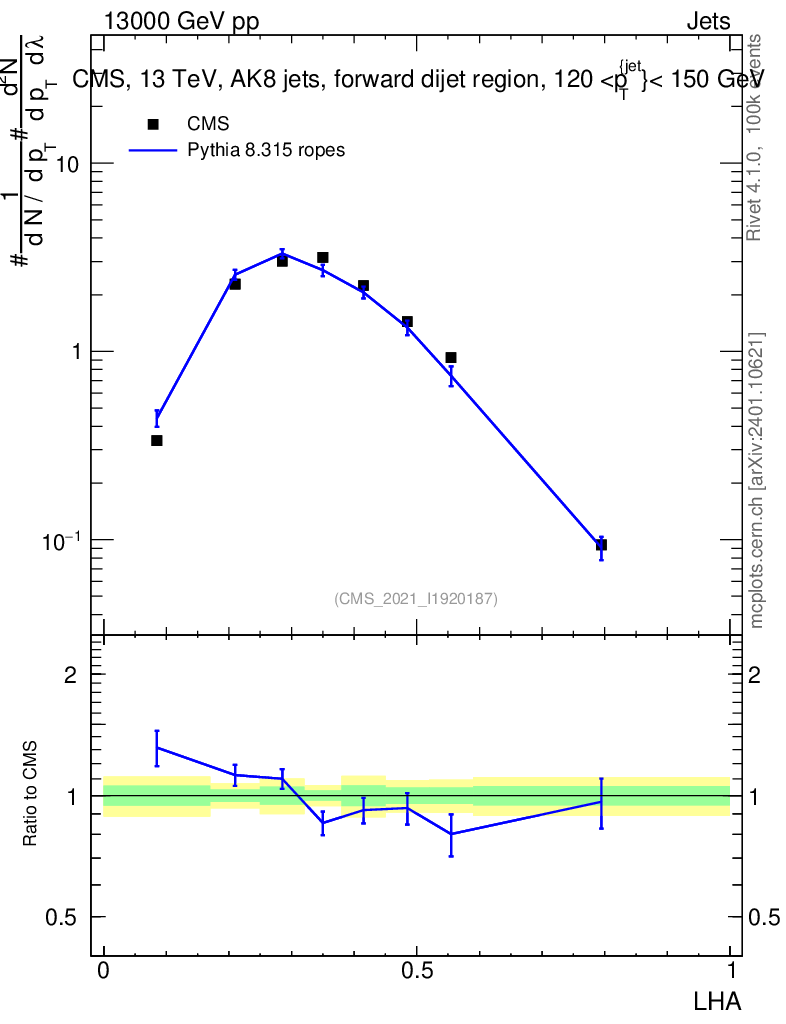 Lines: data, pythia8 8.315 ropes |