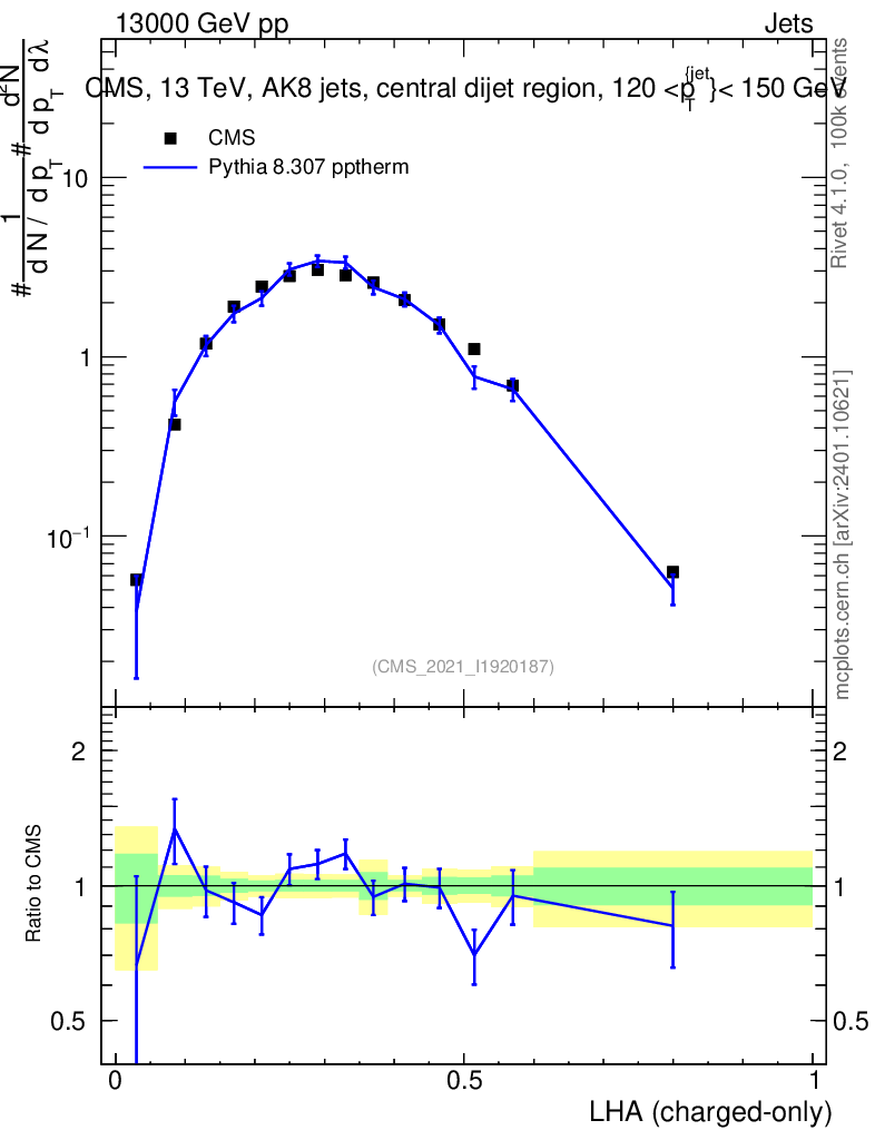 Lines: data, pythia8 8.307 pptherm |