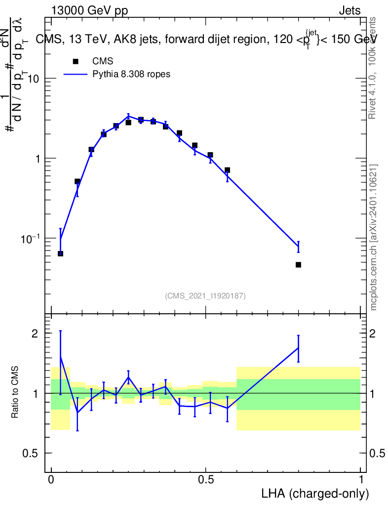 Lines: data, pythia8 8.308 ropes |