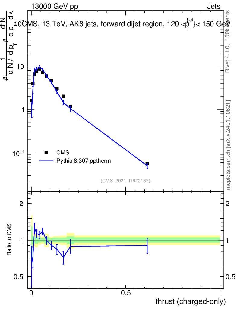 Lines: data, pythia8 8.307 pptherm |