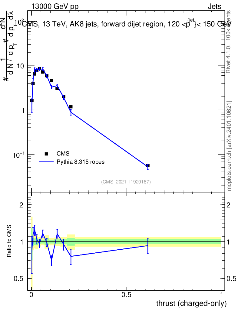 Lines: data, pythia8 8.315 ropes |
