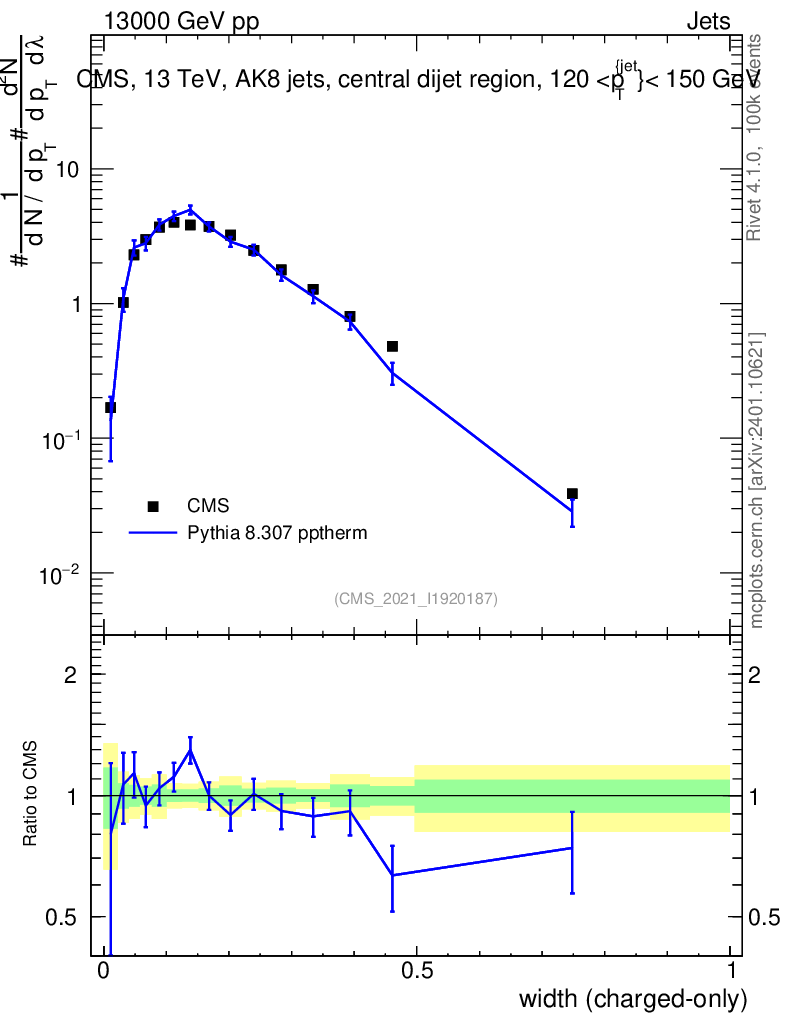 Lines: data, pythia8 8.307 pptherm |