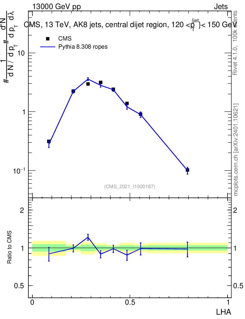 Lines: data, pythia8 8.308 ropes |