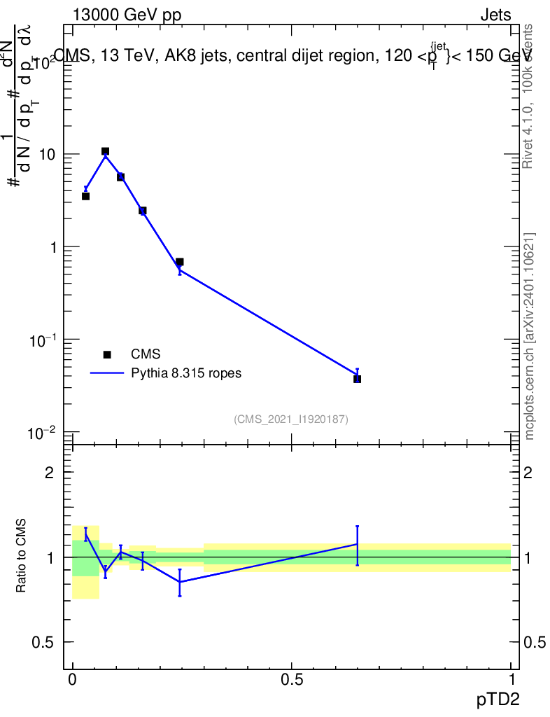 Lines: data, pythia8 8.315 ropes |