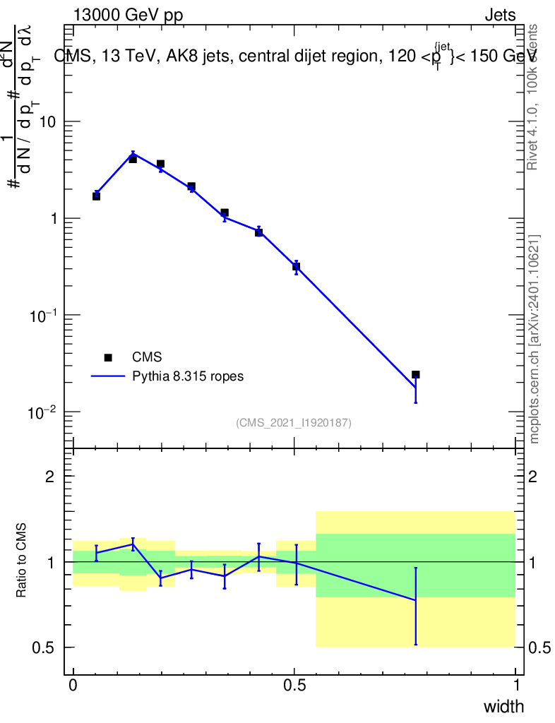 Lines: data, pythia8 8.315 ropes |