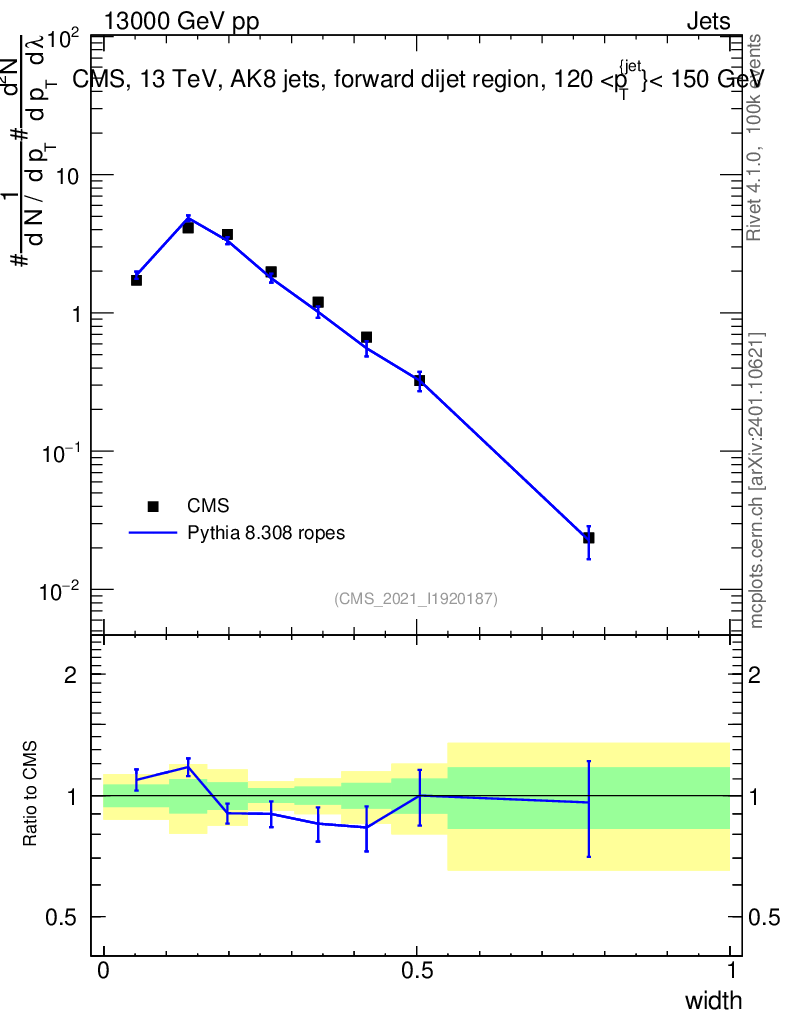 Lines: data, pythia8 8.308 ropes |