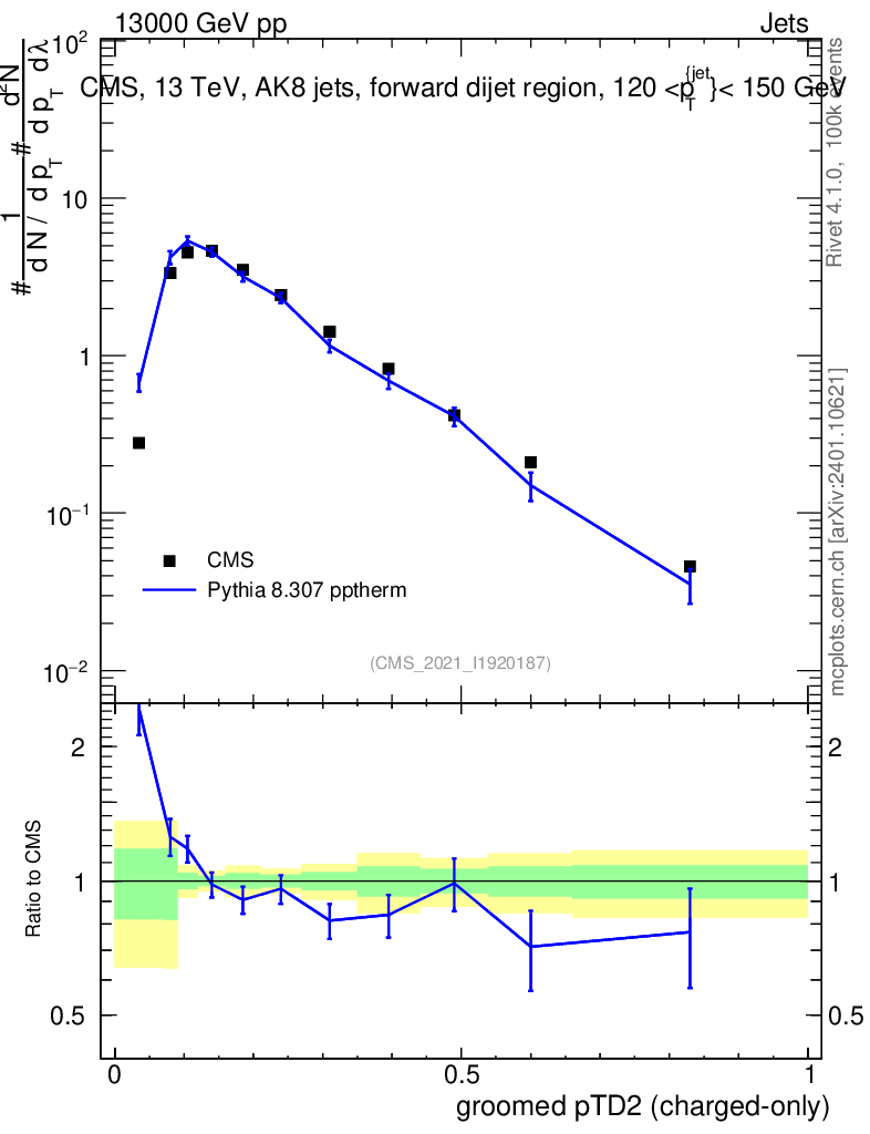 Lines: data, pythia8 8.307 pptherm |