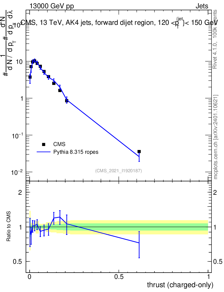 Lines: data, pythia8 8.315 ropes |