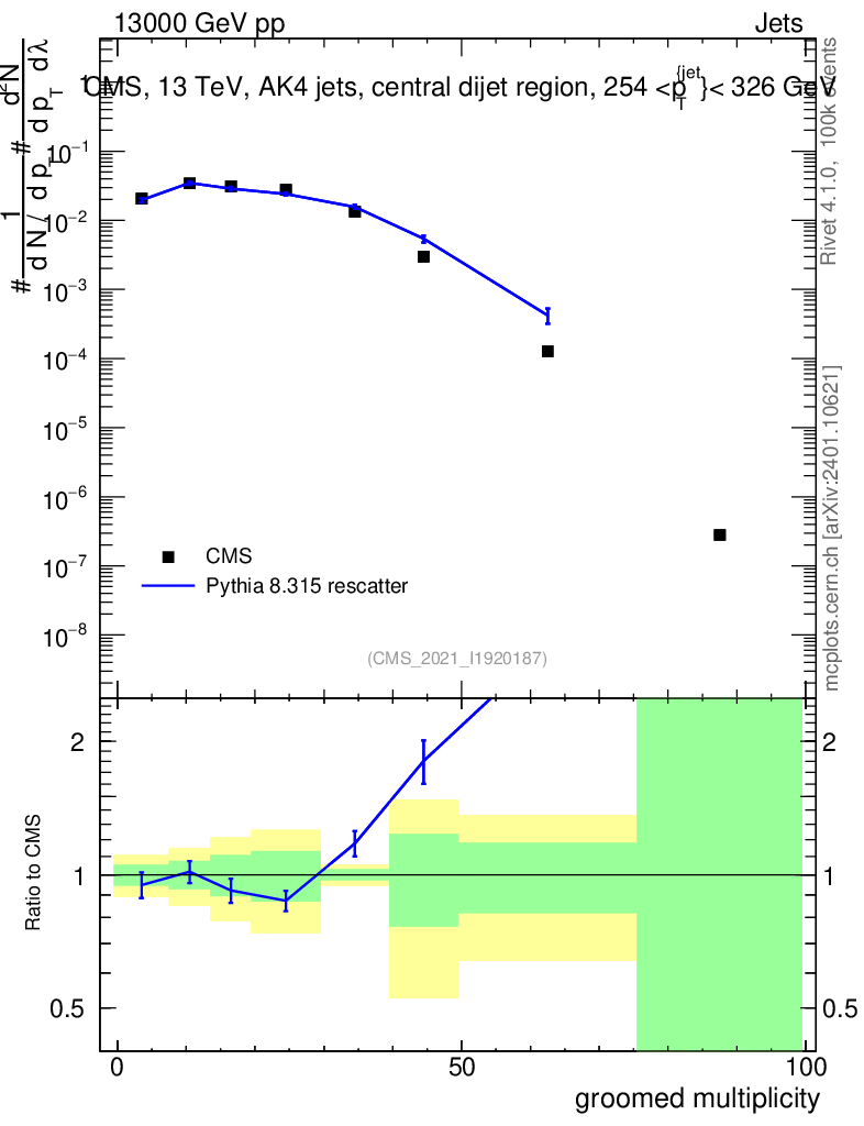 Lines: data, pythia8 8.315 rescatter |