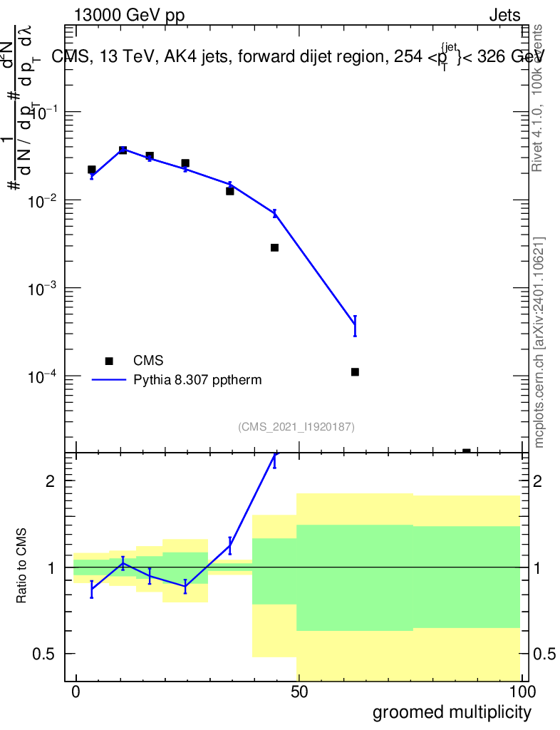 Lines: data, pythia8 8.307 pptherm |