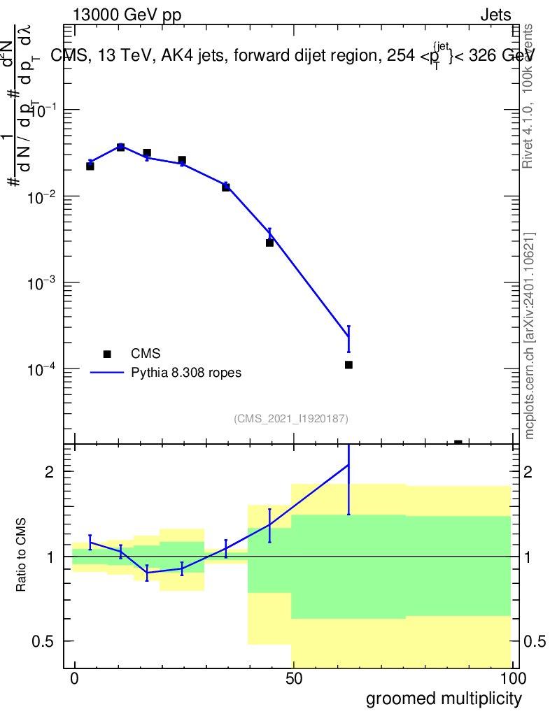 Lines: data, pythia8 8.308 ropes |