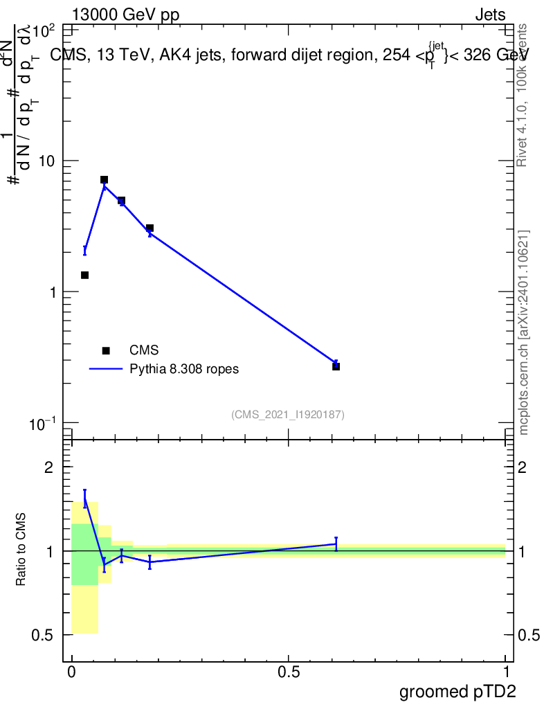 Lines: data, pythia8 8.308 ropes |