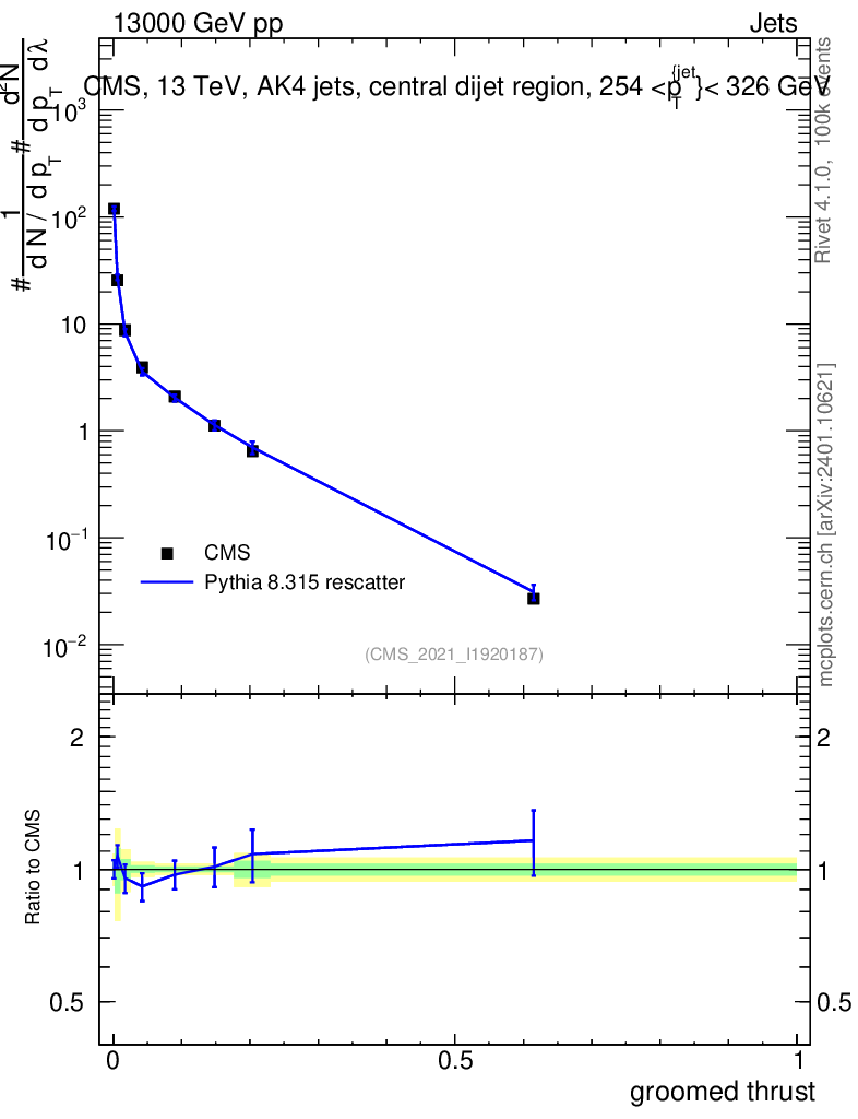 Lines: data, pythia8 8.315 rescatter |