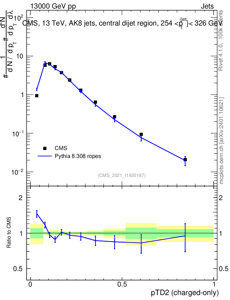 Lines: data, pythia8 8.308 ropes |