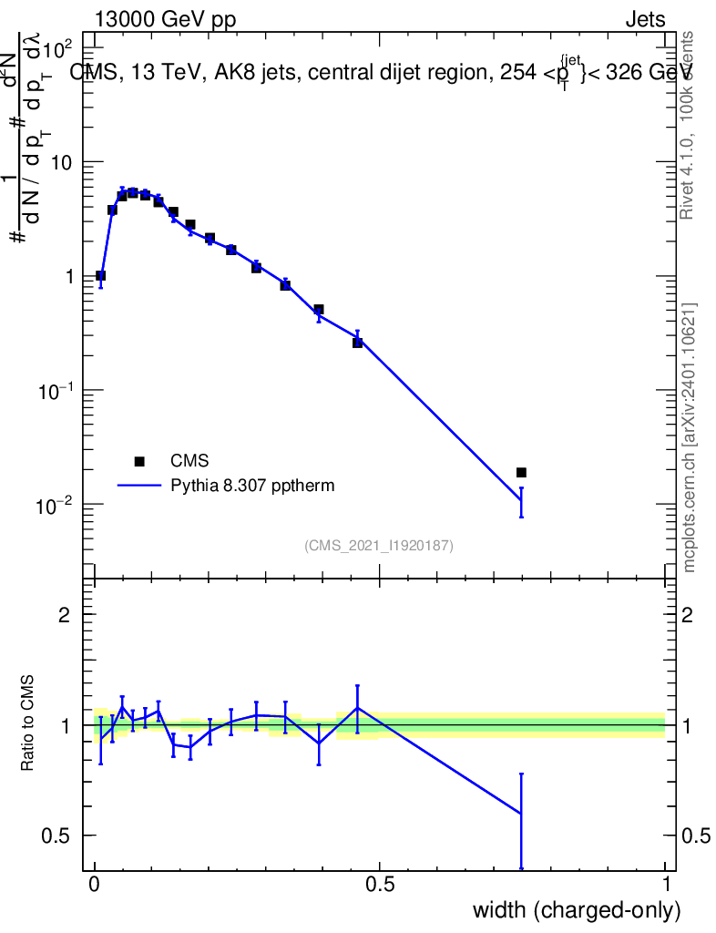 Lines: data, pythia8 8.307 pptherm |