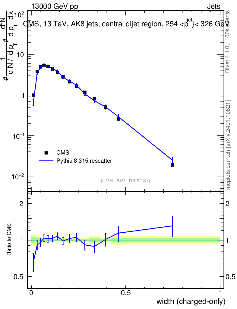Lines: data, pythia8 8.315 rescatter |