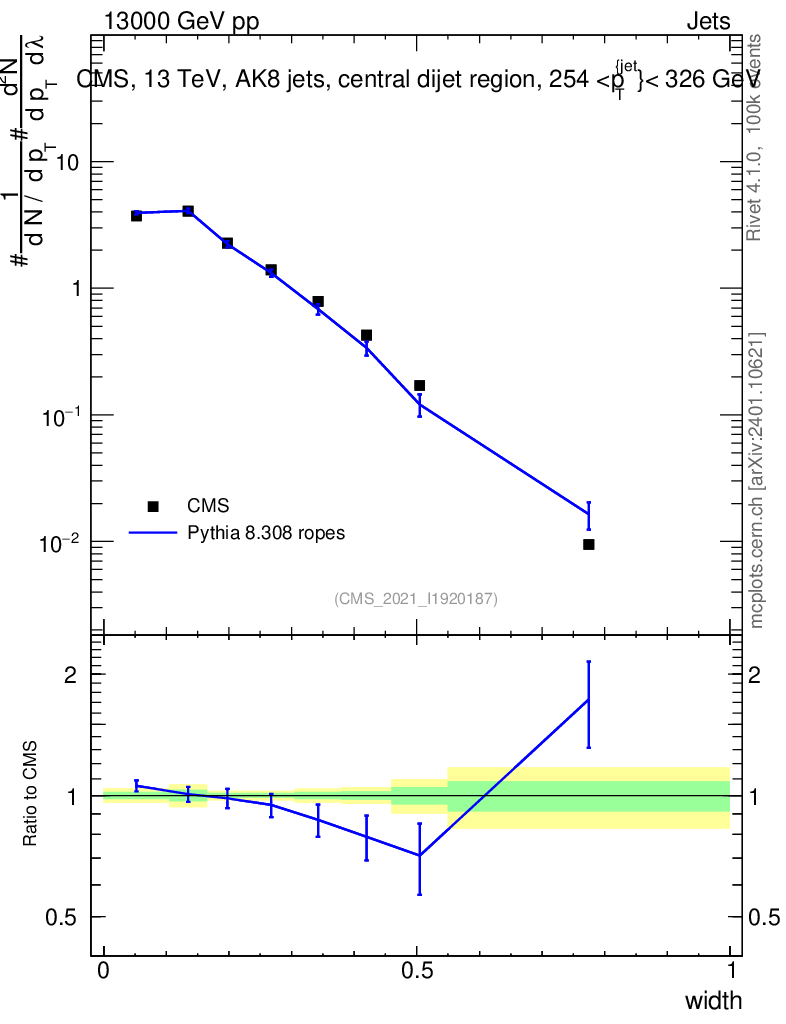 Lines: data, pythia8 8.308 ropes |