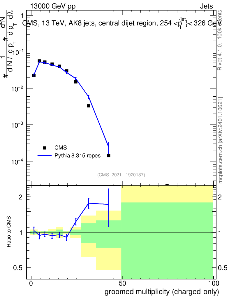 Lines: data, pythia8 8.315 ropes |