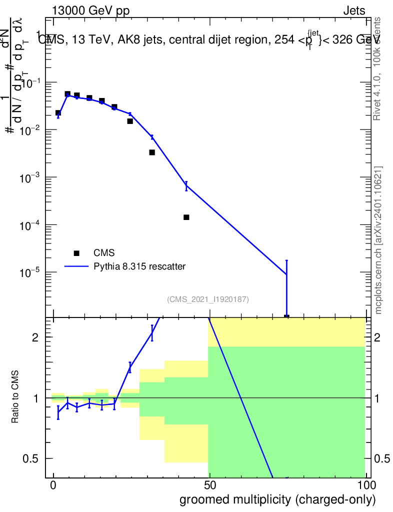 Lines: data, pythia8 8.315 rescatter |
