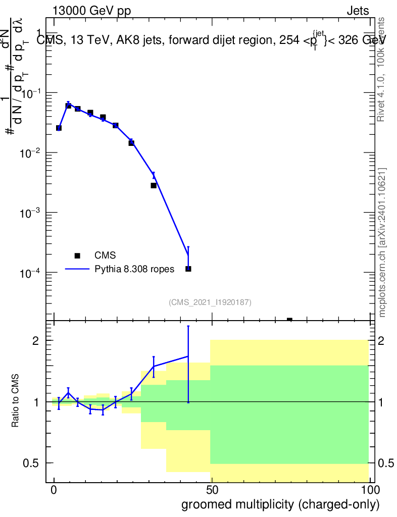 Lines: data, pythia8 8.308 ropes |