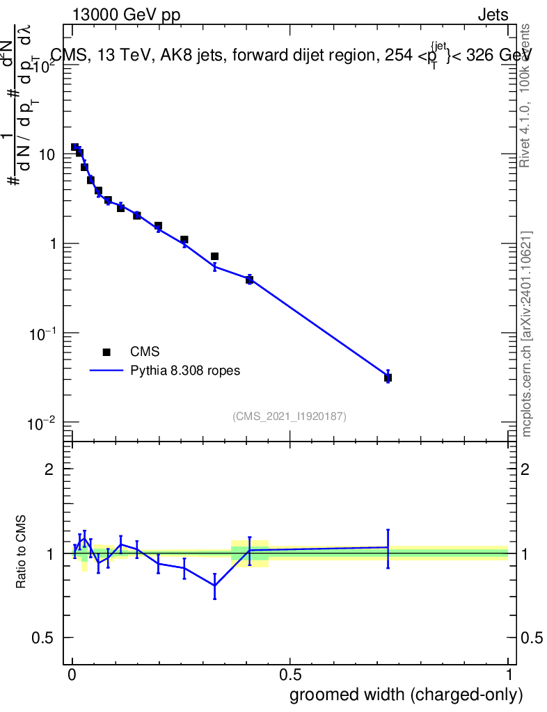 Lines: data, pythia8 8.308 ropes |