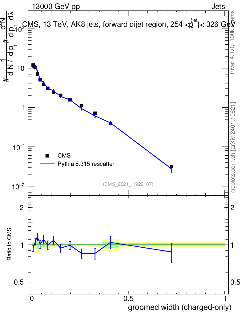 Lines: data, pythia8 8.315 rescatter |