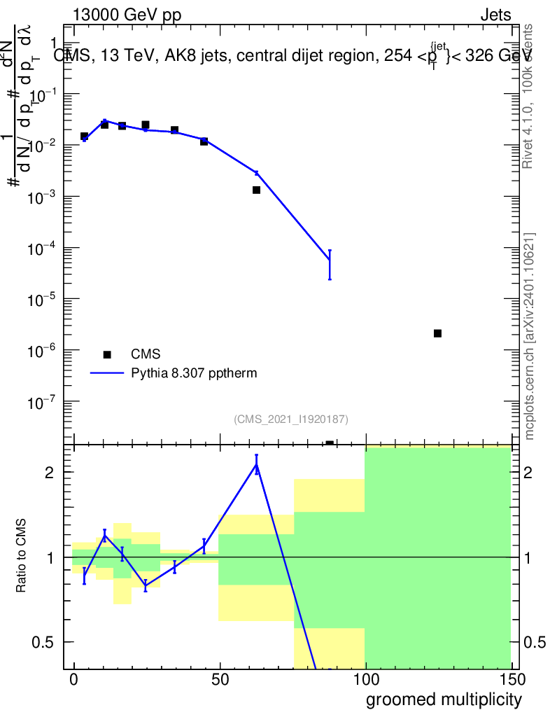 Lines: data, pythia8 8.307 pptherm |