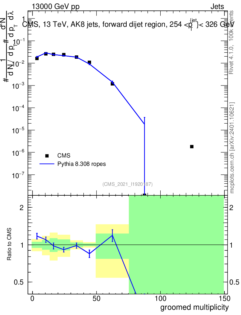 Lines: data, pythia8 8.308 ropes |